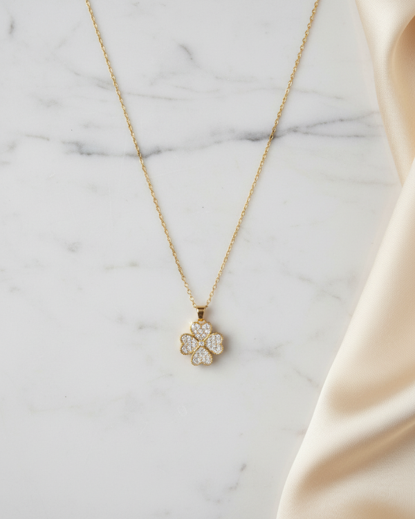 Este sofisticado collar presenta un dije en forma de trébol de cuatro hojas, el símbolo universal de la buena suerte y la prosperidad. Su diseño detallado combina un acabado dorado brillante con una superficie completamente recubierta de micro-strass o cristales que capturan la luz desde cualquier ángulo, aportando un brillo excepcional a tu estilo diario.