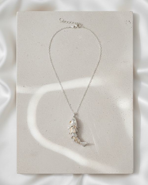 Lleva contigo un símbolo milenario de fortuna y libertad. Este collar destaca por su dije de pez totalmente articulado, diseñado para moverse con cada uno de tus pasos, creando un efecto visual dinámico y fascinante. Sus intrincados detalles y ojos de cristal añaden un toque de misterio y elegancia.
