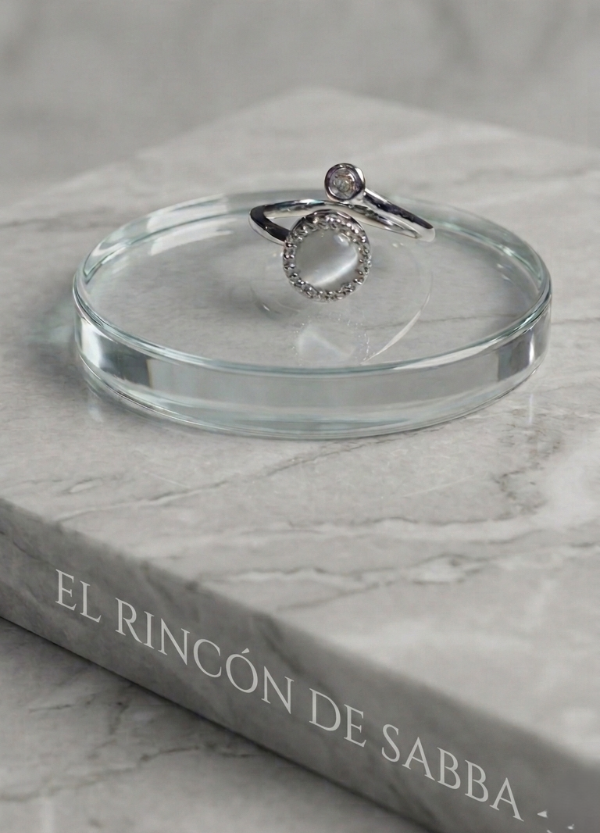 Descubre la armonía perfecta con nuestro anillo "Dualidad Plateada". Esta pieza de diseño abierto presenta dos esferas celestiales de distintos tamaños: una gema central con efecto ópalo que captura la luz con suavidad, y una circonia brillante que aporta un destello de diamante. Enmarcado en un delicado pavé de cristales, este anillo redefine el concepto de lujo moderno.