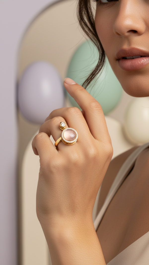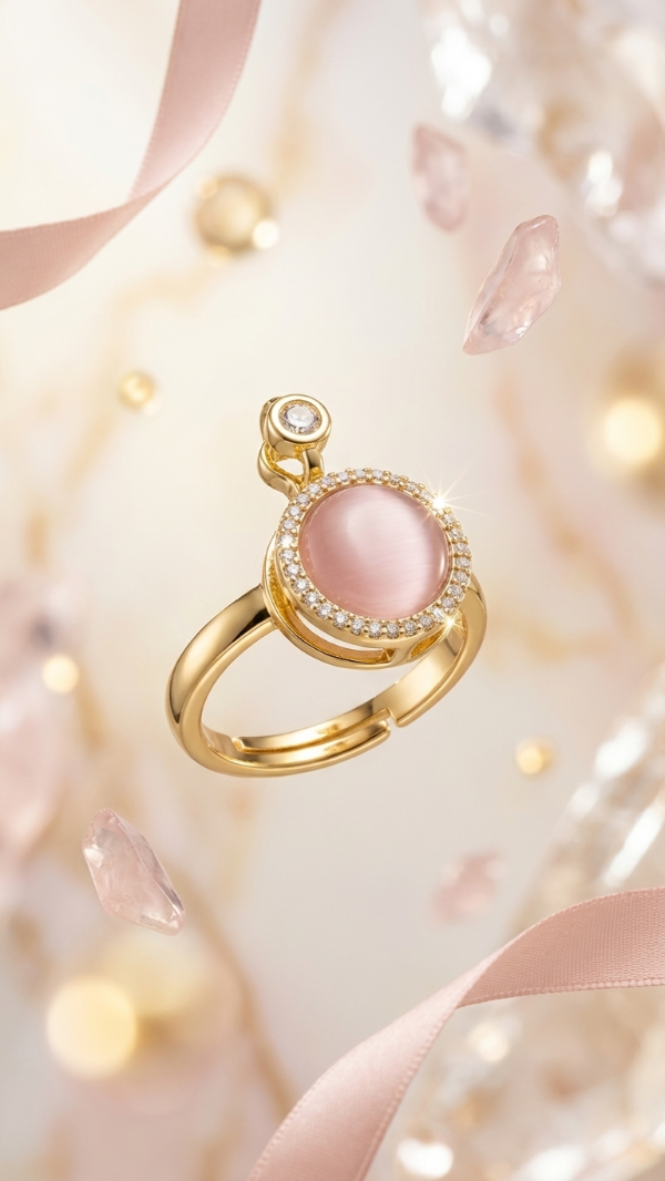 Captura la esencia de los tesoros antiguos con un toque contemporáneo. Este anillo presenta un medallón central con una piedra rosa suave que evoca la serenidad, rodeada por un halo de micro-cristales que añaden un brillo sutil y lujoso. El detalle único: un pequeño dije colgante que aporta movimiento y dinamismo a tu mano.